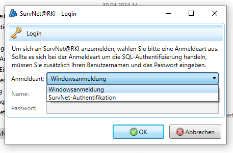 Sie können zwischen zwei Arten der Anmeldung wählen: Bei der Windows-Authentifizierung werden ihre Nutzer- und Passwort-Einstellungen bei der Anmeldung am Rechner/im lokalen Netzwerk verwendet. Sie brauchen daher keine Einträge vorzunehmen. Bei der SurvNet-Authentifizierung verwenden Sie zum Login Nutzername und Passwort, die vom Administrator in der SurvNet-Datenbank für Sie angelegt wurden.