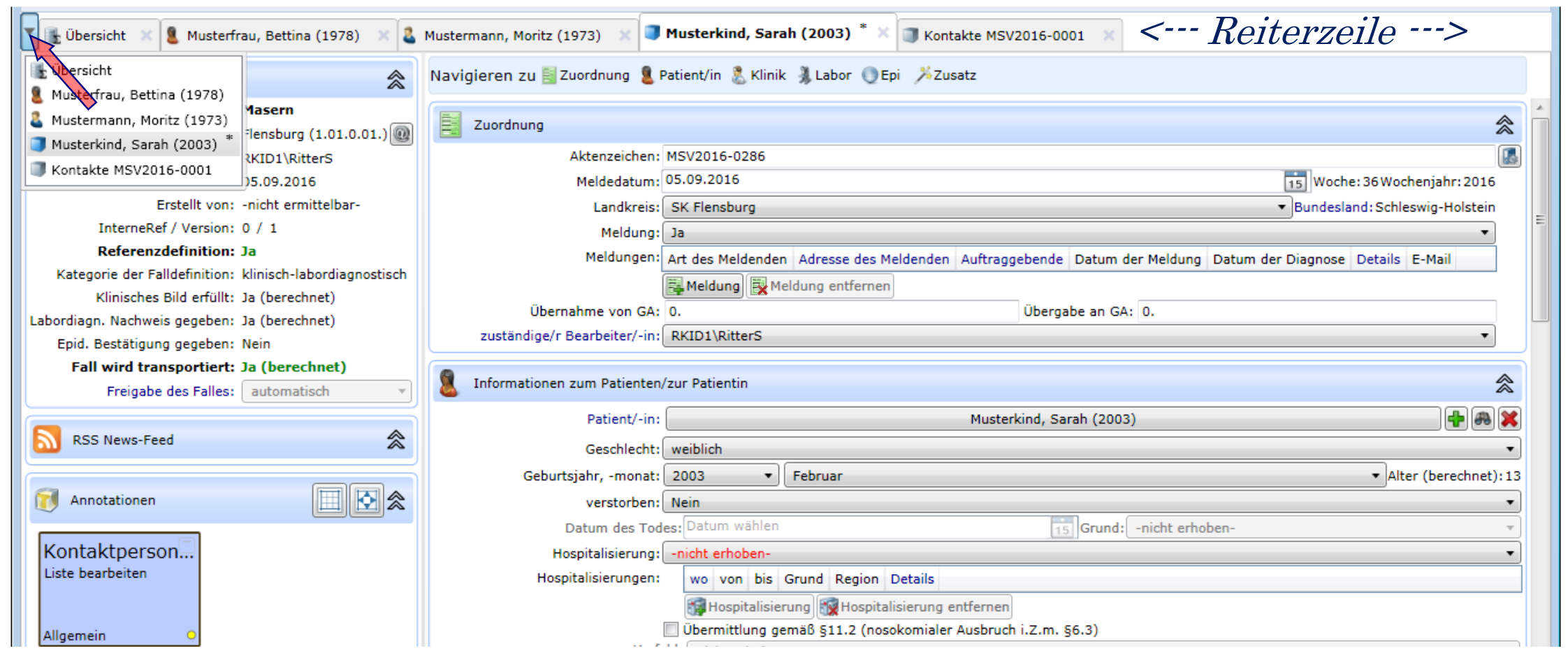 Im Ansichtsbereich werden Fall-, Ausbruchs- und Adress-Datenblätter, Abfragen sowie die Fall- und Personenverwaltung angezeigt und bearbeitet.