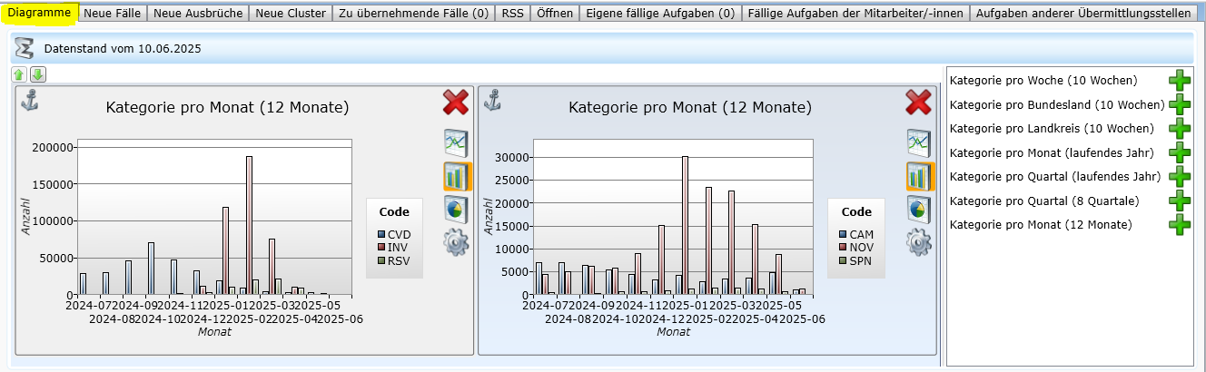 Im Übersichtsregister Diagramme lassen sich die im aktuellen Datenbestand vorhandenen Fälle der letzten 10 Wochen bzw. des laufenden Jahres grafisch darstellen.
