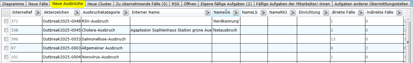 In den Registern Neue Fälle/Neue Ausbrüche werden im Gesundheitsamt die zuletzt angelegten bzw. in der Landesstell/dem RKI die zuletzt importierten Fälle/Ausbrüche gelistet.