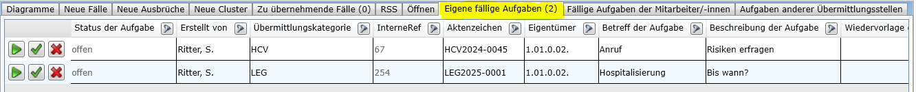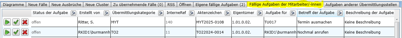 In den Registern Eigene fällige Aufgaben und Fällige Aufgaben der Mitarbeiter/-innen werden die Datensätze angezeigt, für die eine Aufgabe in der laufenden Arbeitswoche vermerkt ist.