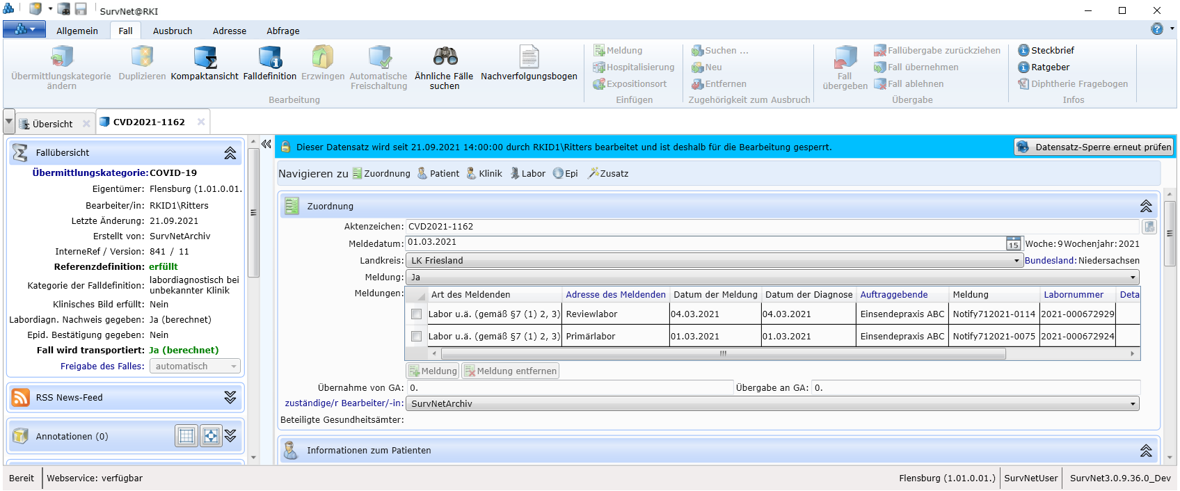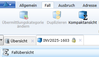 Wird ein Datensatz geöffnet, dessen Eigentümer eine andere SurvNet-Instanz (ein anderes Gesundheitsamt, Landesstelle, RKI) ist, so kann dieser Datensatz nicht bearbeitet werden. Die Fremd-Eigentümerschaft wird durch ein Vorhängeschloss am Reiter des Datenblattes kenntlich gemacht (Abb. [Kennzeichnung eines Falles in fremder Eigentümerschaft]