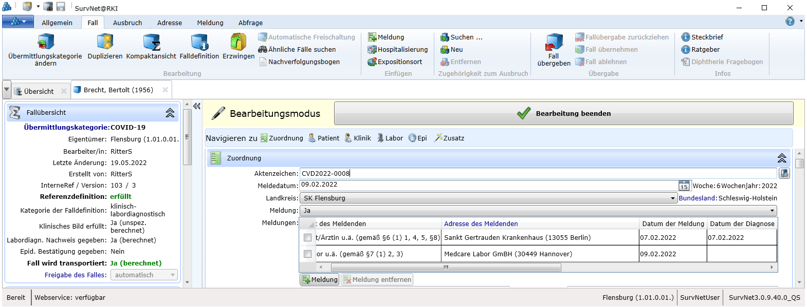 Je mehr Nutzer im Gesundheitsamt gleichzeitig auf den lokalen Datenbestand zugreifen, umso wahrscheinlicher ist es, dass von mehreren Nutzern versucht wird, denselben Datensatz zeitgleich zu bearbeiten (z.B. nach Eingang mehrerer Ergänzungs-Meldungen zu selben Person). Um dies zu verhindern, kann jeder Datensatz nur von einem Nutzer im