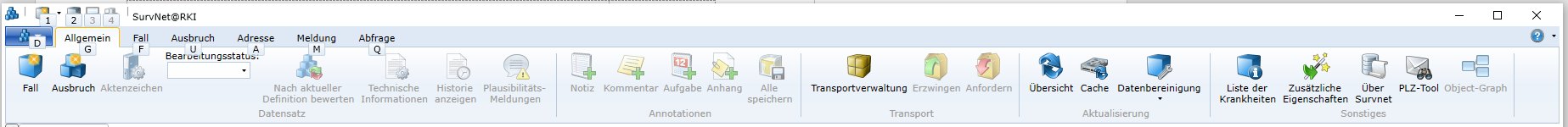 Je nach Art des geöffneten Datensatzes wechselt SurvNet@RKI automatisch in das jeweilige Register der Multifunktionsleiste, das die Befehle zur Bearbeitung des Datensatztyps enthält.