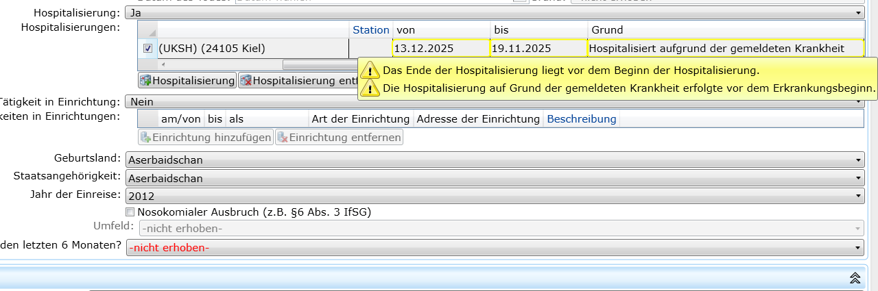 Bei der Dateneingabe zu Fällen und Ausbrüchen wird im Hintergrund sofort überprüft, ob Einträge plausibel und in sich konsistent sind. So kann z.B. ein Geburts-, Erkrankungs- oder Todesdatum nicht in der Zukunft liegen, ein Meldedatum nicht vor dem Erkrankungsdatum, etc. Verstößt eine Angabe gegen eines oder mehrere der hinterlegten Prüfkriterien, erscheint ein