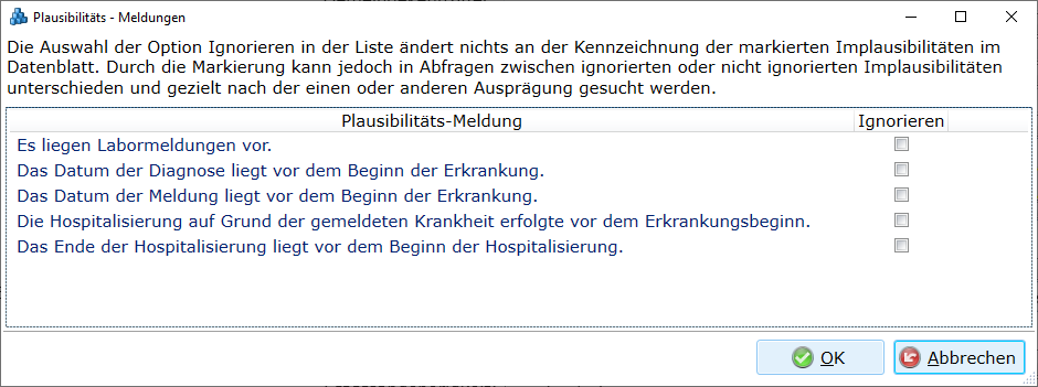 Plausibilitäts-Meldungen im Register Allgemein der Multifunktionsleiste wird eine Liste mit allen implausiblen Einträgen des geöffneten und gespeicherten Datensatzes generiert. Die Auswahl der Option Ignorieren in der Liste ändert nichts an der Kennzeichnung der markierten Implausibilitäten im Datenblatt. Durch die Markierung kann jedoch in Abfragen zwischen ignorierten oder nicht ignorierten Implausibilitäten unterschieden und gezielt nach der einen oder anderen Ausprägung gesucht werden.