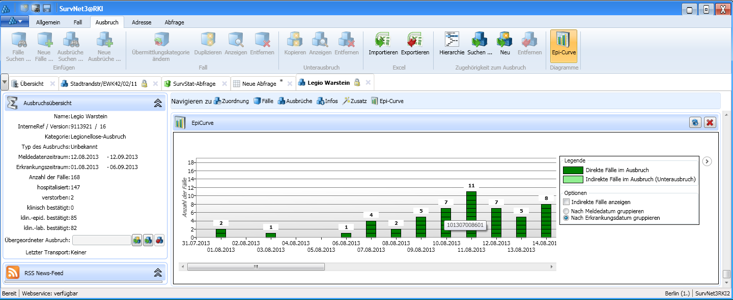 INFO Nach Bearbeitung, Hinzufügen, oder Entfernen von Fällen kann sich der Bezugstag des Ausbruchs ändern.