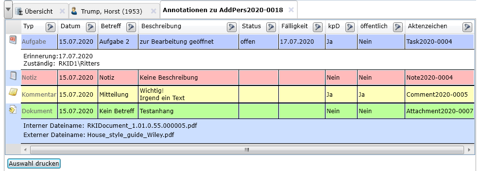 Einem Datensatz können auch mehrere Anhänge beigefügt werden. Diese werden gemeinsam mit den vorhandenen Notizen, Kommentaren und Aufgaben (siehe 3.10.1, 3.10.2 und 3.10.3) in chronologischer Reihenfolge im Abschnitt Annotationen dargestellt.