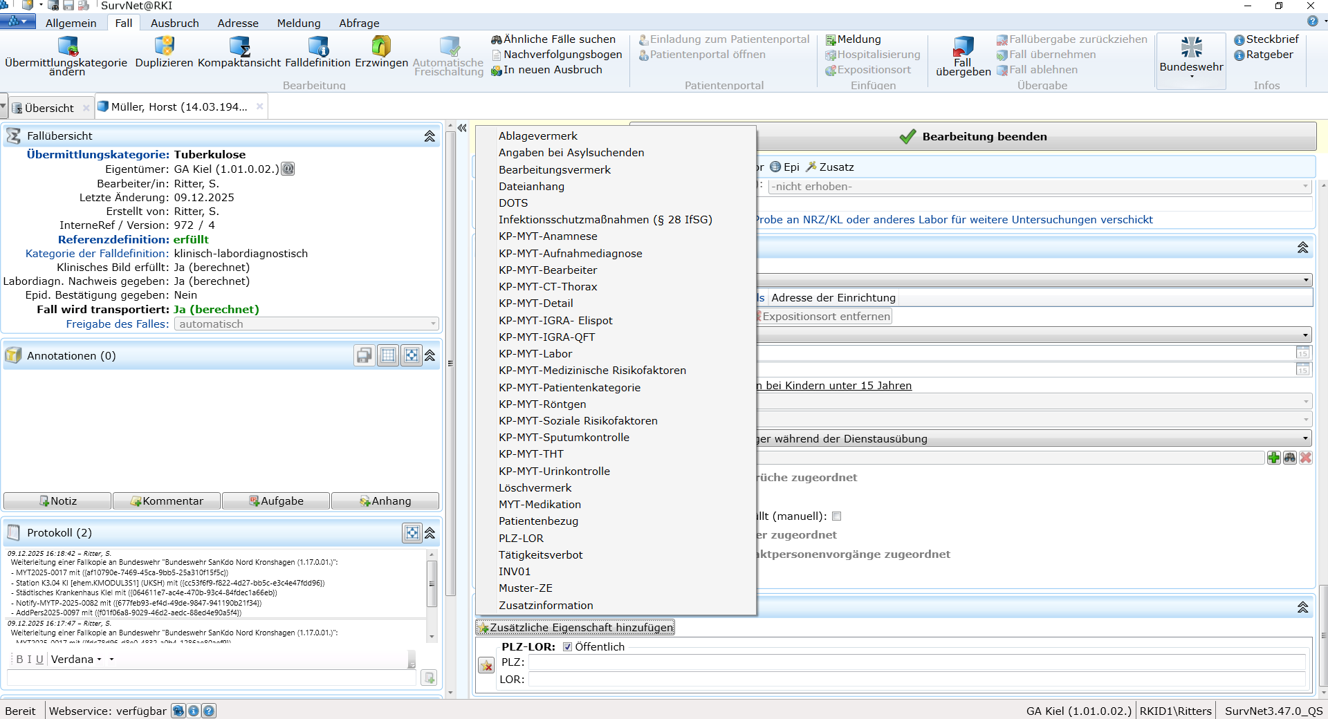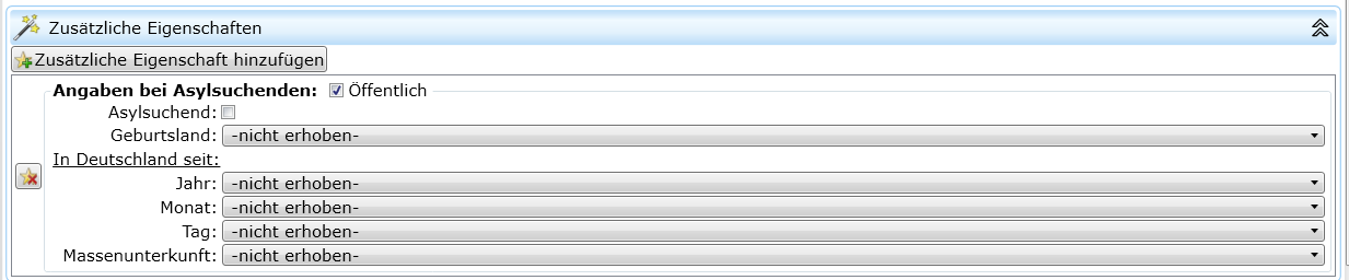 Zusätzliche Eigenschaften des Fall-, Ausbruchs- oder Adress-Datenblattes die Möglichkeit, neue Felder einzubauen. Auch Notizen und Kommentare lassen sich durch Zusätzliche Eigenschaften ergänzen. Damit können Informationen, die sich mit den bereits vorhandenen Feldern nicht abbilden lassen, strukturiert erfasst und ggf. auch übermittelt werden. Verglichen mit der bisherigen Praxis, mehr oder minder komplexe, zusätzliche Informationen über ein einziges, unstrukturiertes Freitextfeld zu übermitteln, bietet sich damit die Möglichkeit, Datensätze gezielt nach zusätzlichen Eigenschaften und deren Inhalt zu filtern.