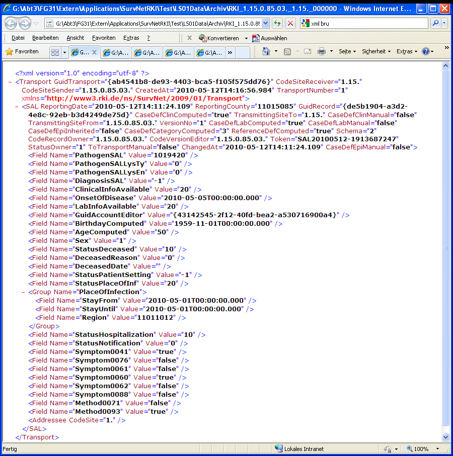 Alle weiteren Eigenschaften durch sog. Field-Elemente (Name/Value-Paare) bestehend aus Feldname z.B. PathogenSAL und Feldinhalt (Value).