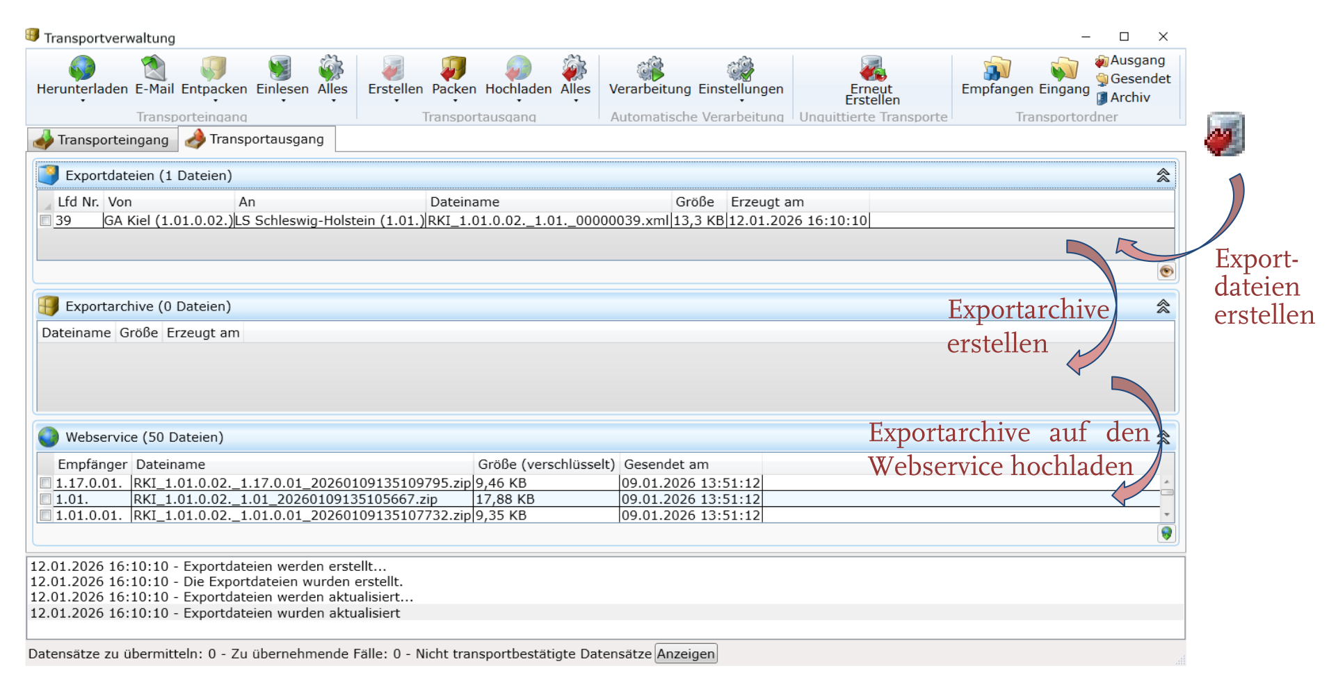 Schlägt ein Transport fehl, bleibt also die Quittungsdatei für den Transportvorgang aus, kann der Export erneut angestoßen werden. Nach Betätigen der Schaltfläche