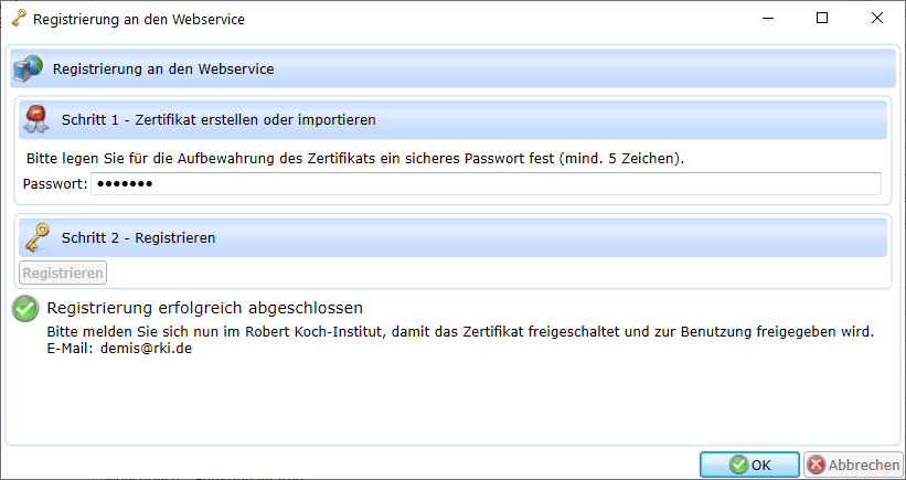 - In Schritt 2 der Registrierung muss das Zertifikat an den Webservice übermittelt werden.