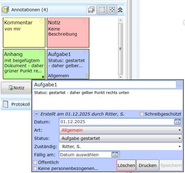 - Sehen Sie sich die Buttons an. Die Notiz kann gelöscht, gedruckt und gespeichert werden.